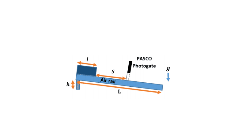 Additional Info. ID Code: C4-31 Purpose: Experimentally determine the acceleration of gravity. Description: One end of the air track is elevated at an angle a so that the glider will accelerate down the slope with some component of the acceleration of gravity. This component is determined experimentally by measuring the velocity v of the glider after it has accelerated a fixed distance S down ...